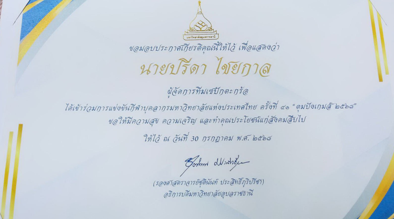 ในโอกาสที่ได้รับ ประกาศเกีตรติคุณ ที่เข้าร่วมการแข่งขันกีฬาบุคลากรมหาวิทยาลัยแห่งประเทศไทย ครั้งที่ 41 “ตุมปังเกมส์ 2568”