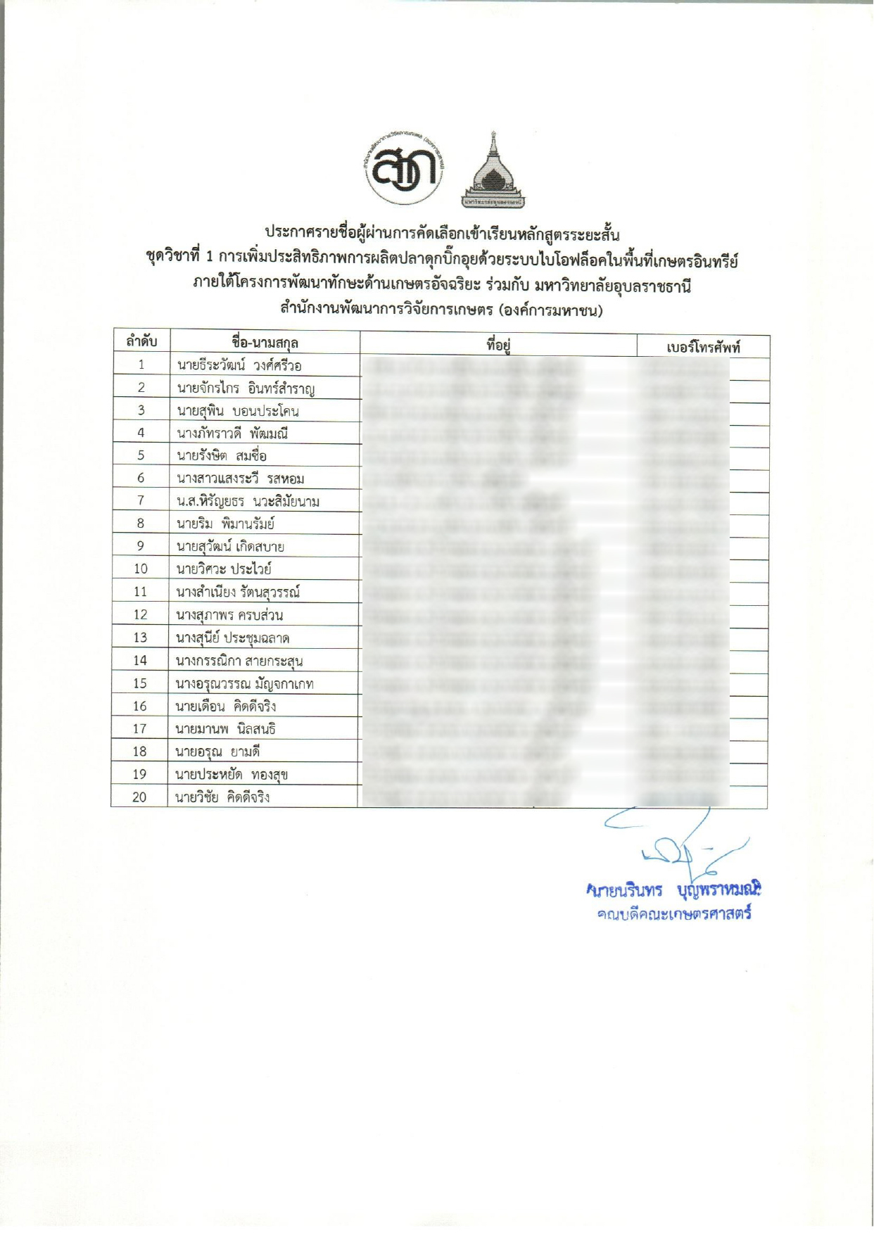 - ประกาศรายชื่อผู้ผ่านการคัดเลือกหลักสูตรระยะสั้น ชุดวิชาที่ 1 การเพิ่มประสิทธิภาพการผลิตปลาดุกบิ๊กอุยด้วยระบบไบโอฟล็อคในพื้นที่เกษตรอินทรีย์ ภายใต้โครงการพัฒนาทักษะด้านเกษตรอัจฉริยะ ร่วมกับ มหาวิทยาลัยอุบลราชธานี สำนักงานพัฒนาการวิจัยการเกษตร (องค์การมหาชน)