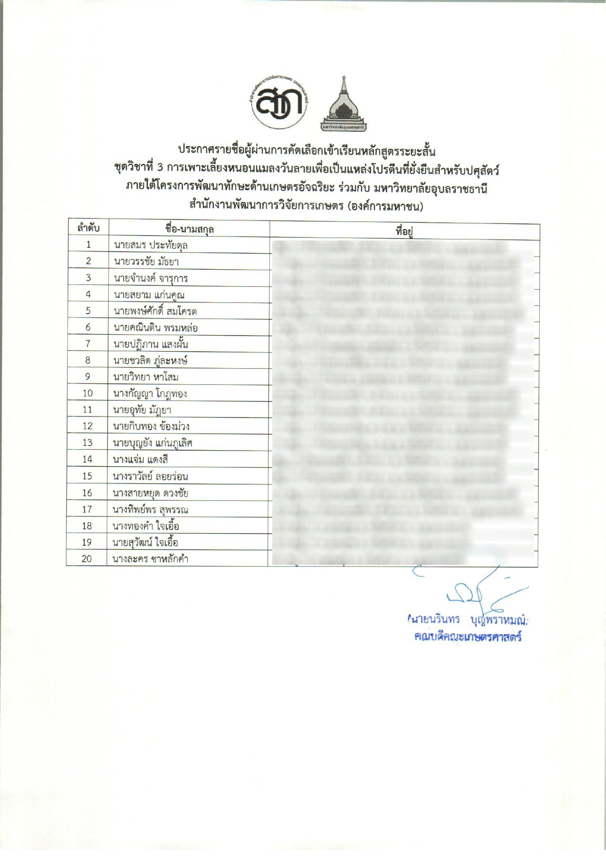 - ประกาศรายชื่อผู้ผ่านการคัดเลือกหลักสูตรระยะสั้น ชุดวิชาที่ 3 การเพาะเลี้ยงหนอนแมลงวันลายเพื่อเป็นแหล่งโปรตีนที่ยั่งยืนสำหรับปศุสัตว์ ภายใต้โครงการพัฒนาทักษะด้านเกษตรอัจฉริยะ ร่วมกับ มหาวิทยาลัยอุบลราชธานี สำนักงานพัฒนาการวิจัยการเกษตร (องค์การมหาชน)