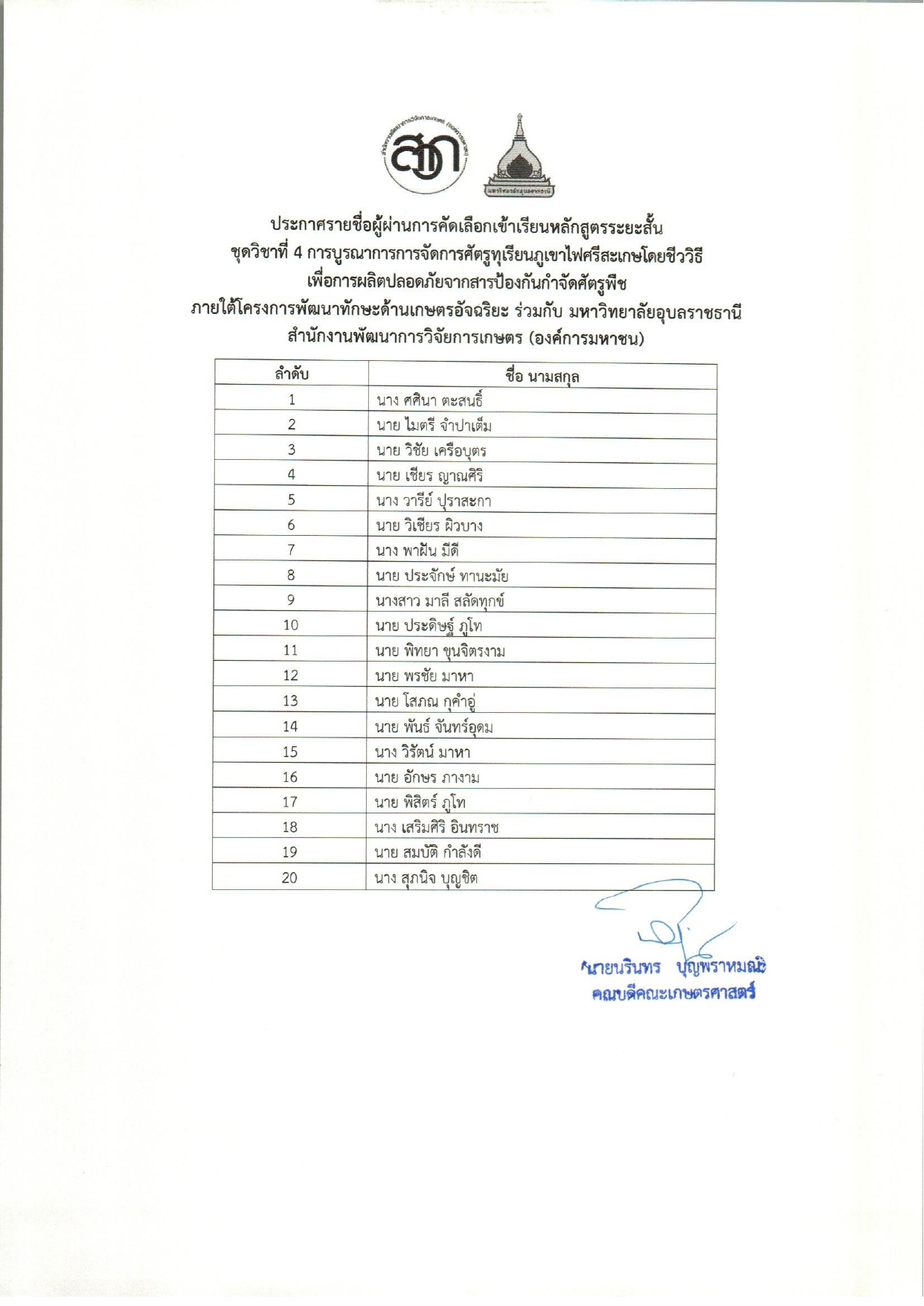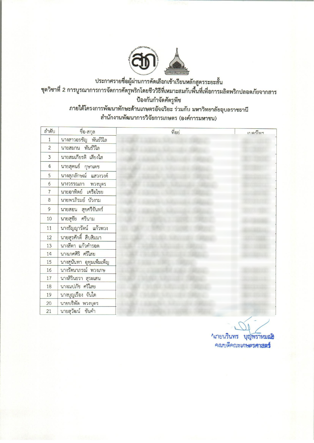 - ประกาศรายชื่อผู้ผ่านการคัดเลือกหลักสูตรระยะสั้น ชุดวิชาที่ 4 การบูรณาการการจัดการศัตรูทุเรียนภูเขาไฟศรีสะเกษโดยชีววิธี เพื่อการผลิตปลอดภัยจากสารป้องกันกำจัดศัตรูพืช ภายใต้โครงการพัฒนาทักษะด้านเกษตรอัจฉริยะ ร่วมกับ มหาวิทยาลัยอุบลราชธานี สำนักงานพัฒนาการวิจัยการเกษตร (องค์การมหาชน)