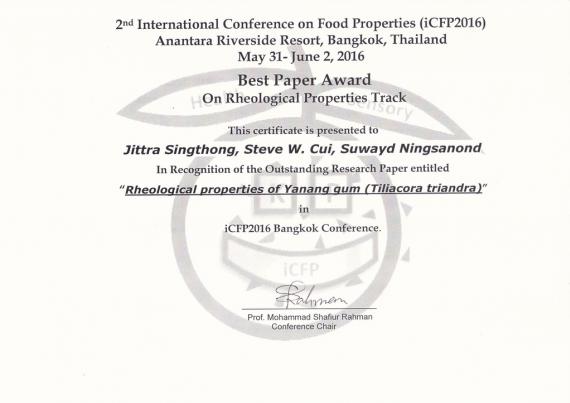 ขอแสดงความยินดีกับ ผศ.ดร.จิตรา สิงห์ทอง สาขาวิชาอุตสาหกรรมเกษตร คณะเกษตรศาสตร์ ที่ได้รับรางวัลบทความดีเด่น (The Best Paper Award) ในสาขา Rheological Properties จากการนำเสนอบทความวิจัย เรื่อง "Rheological Properties of Yanang Gum" ในการประชุมนานาชาติ 2nd International Conference on Food Properties (ICFP 2016) ณ โรงแรม Anantara Riverside Resort กรุงเทพฯ, 31 พ.ค. - 2 มิ.ย. 2559 2 ภาพ