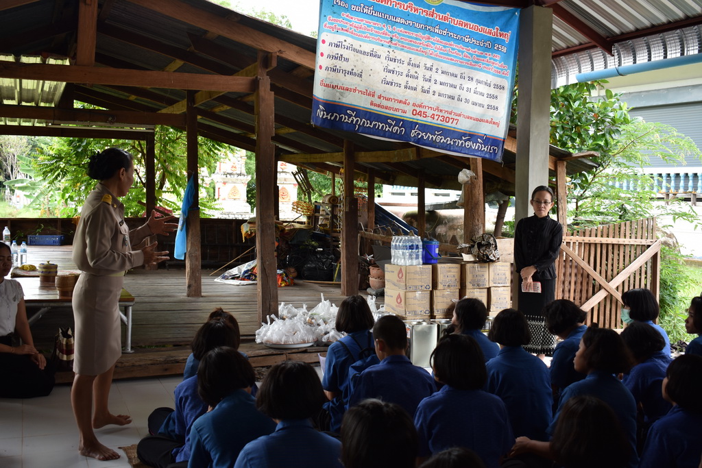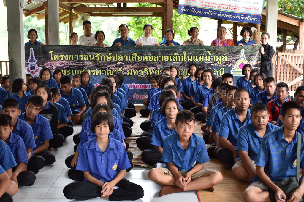นักเรียนโรงเรียนชุมชนบ้านวังสะแบง แจกเอกสารประชาสัมพันธ์ให้กับชุมชนชาวประมงในลุ่มน้ำมูล