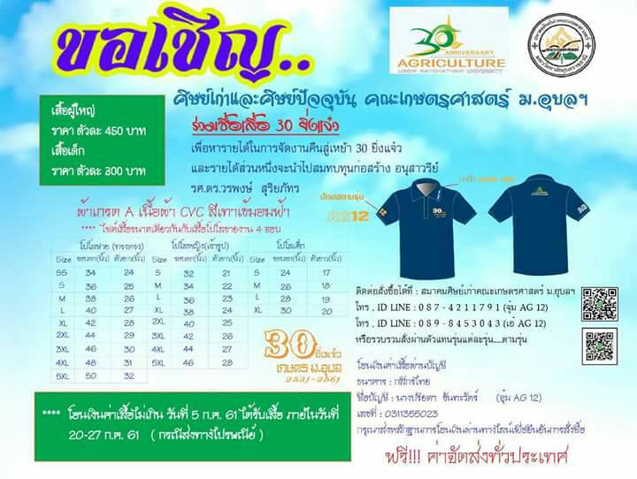 รายละเอียดกิจกรรม : ขอเชิญศิษย์เก่าและศิษย์ปัจจุบัน คณะเกษตรศาสตร์ ม.อุบลฯ ร่วมซื้อเสื้อ 30 ยิ่งแจ๋ว เพื่อหารายได้ในการจัดงานคืนสู่เหย้า 30 ยิ่งแจ๋ว กลุ่มด้านประกันคุณภาพ : 3. กิจกรรมการพัฒนานิสิตนักศึกษา 6. การทำนุบำรุงศิลปวัฒนธรรม จำนวน 4 ภาพ |