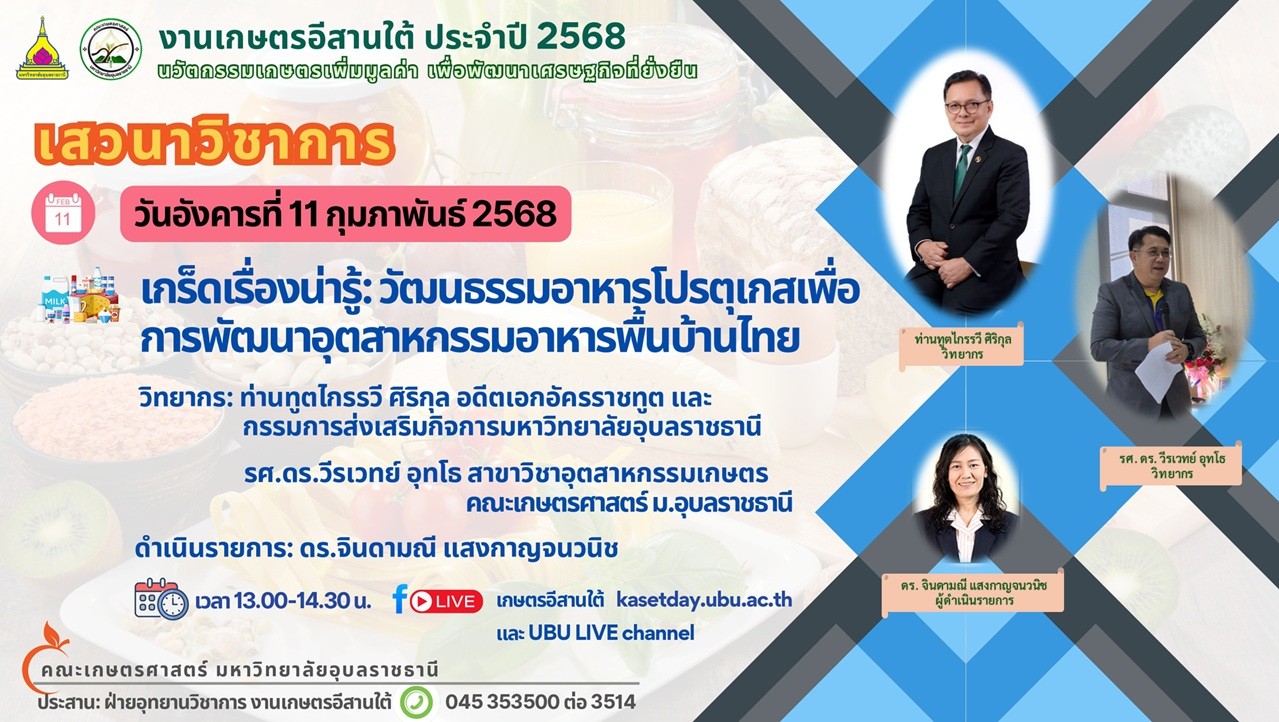 รายละเอียดกิจกรรม : เสวนาวิชาการวในงานเกษตรอีสานใต้ 2568 หัวข้อ "เกร็ดเรื่องน่ารู้วัฒนธรรมอาหารโปรตุเกสเพื่อการพัฒนาอุตสาหกรรมอาหารพื้นบ้านไทย" ในวันอังคาร ที่ 11 กุมภาพันธ์ 2568 เวลา 13-14.30 น ในรูปแบบของการเสวนาออนไลน์ จากห้องกระจายเสียงและถ่ายทอดสด ฝ่ายเทคโนโลยีการศึกษา สำนักวิทยบริการ มหาวิทยาลัยอุบลราชธานี และถ่ายทอดสด LIVE ผ่าน Facebook "เกษตรอีสานใต้" และช่อง YouTube "UBU LIVE Channel" วิทยากร: ท่านทูตไกรรวี ศิริกุล อดีตเอกอัครราชทูต และกรรมการส่งเสริมกิจการมหาวิทยาลัยอุบลราชธานี รศ.ดร.วีรเวทย์ อุทโธ สาขาวิชาอุตสาหกรรมเกษตร คณะเกษตรศาสตร์ มหาวิทยาลัยอุบลราชธานี ดำเนินรายการโดย ดร.จินดามณี แสงกาญจนวนิช กลุ่มด้านประกันคุณภาพ : 5. การบริการทางวิชาการแก่สังคม จำนวน 9 ภาพ |