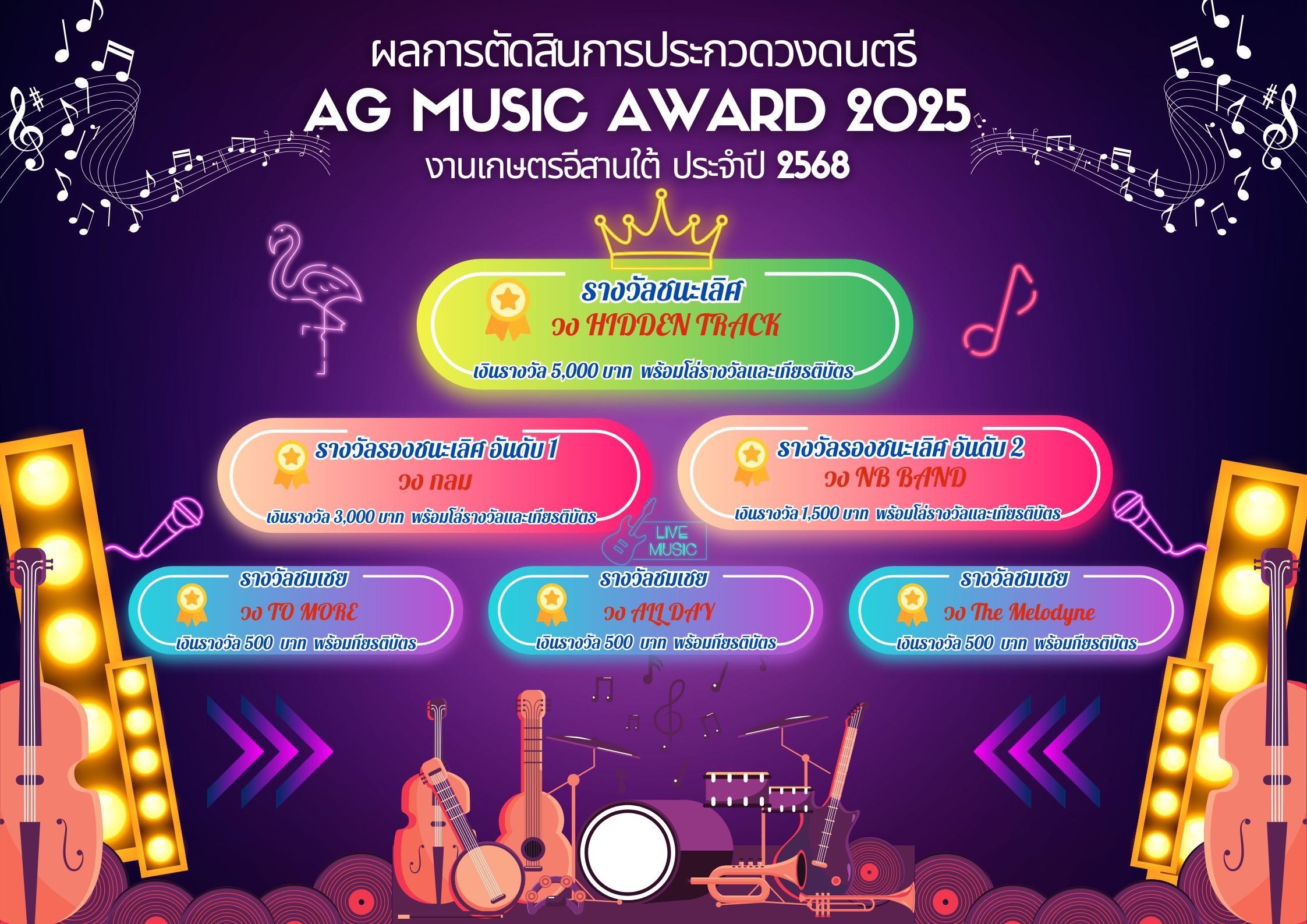 รายละเอียดกิจกรรม : ผลการประกวดวงดนตรี AG MUSIC AWAD 2025 รอบชิงชนะเลิศ ในงานเกษตรอีสานใต้ ประจำปี 2568, 14 กุมภาพันธ์ 2568