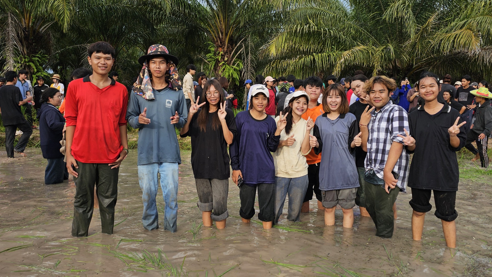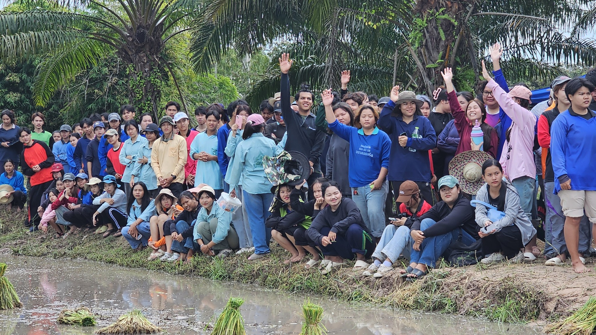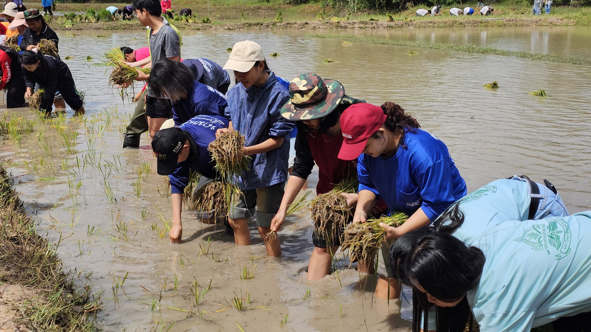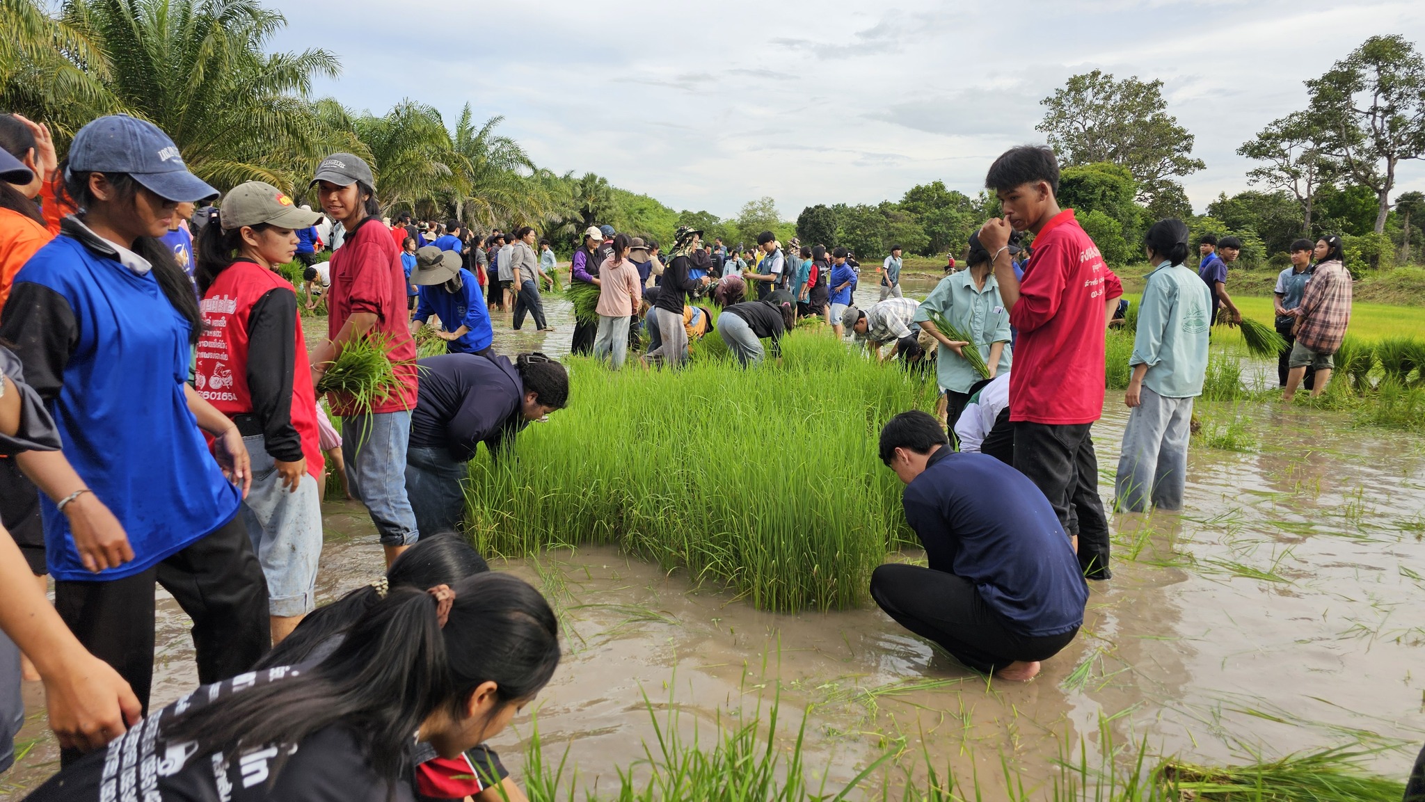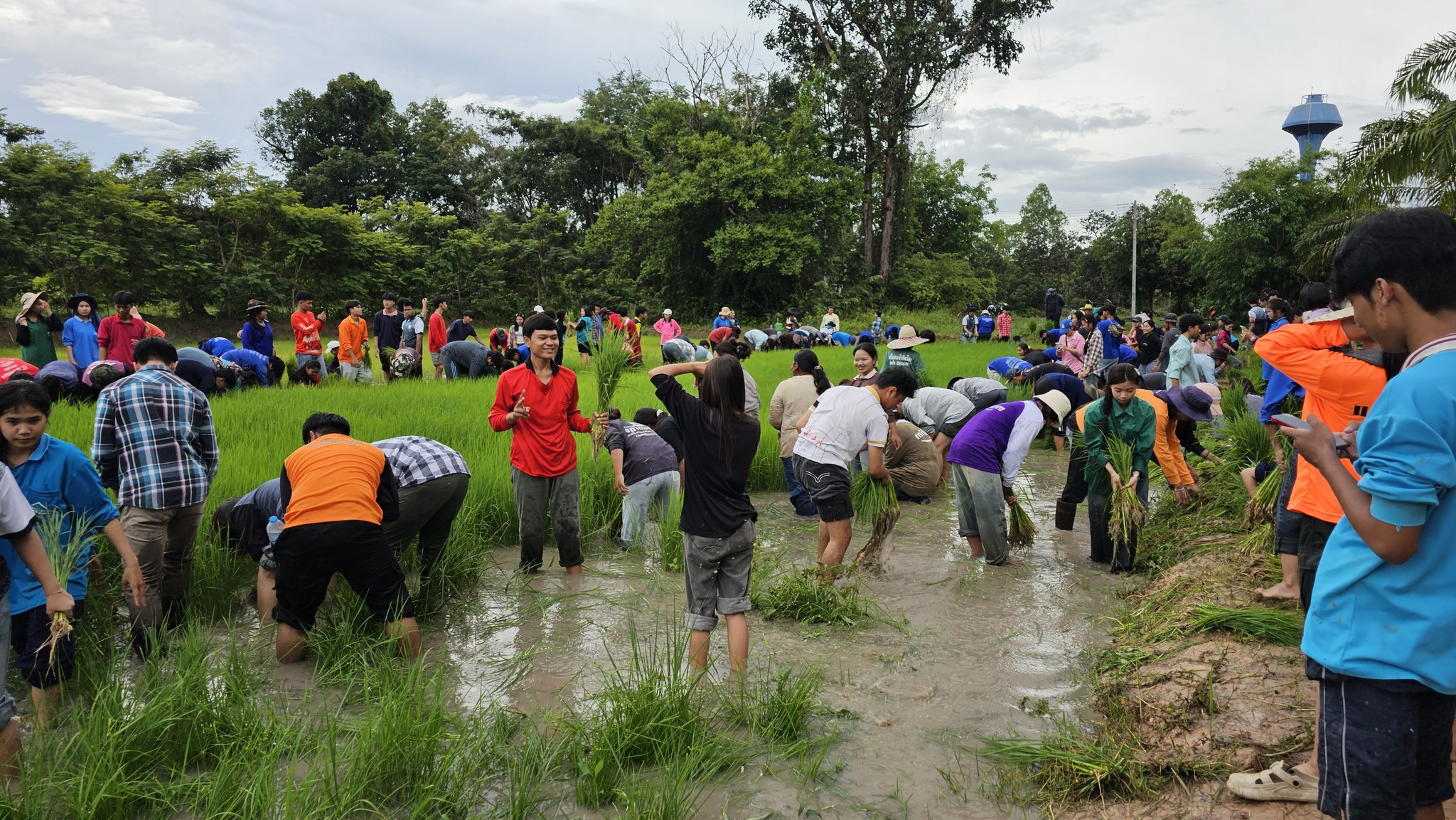รายละเอียดกิจกรรม : สโมสรนักศึกษาคณะเกษตรศาสตร์ จัดกิจกรรมต้อนรับน้องใหม่แบบสร้างสรรค์เชิงเกษตร ภายใต้โครงการมือเรียวรอเกี่ยวรวง (ระยะที่ 1 ดำนา) ประจำปีการศึกษา 2568 โดยมี ดร.นรินทร บุญพราหมณ์ คณบดีคณะเกษตรศาสตร์ เป็นประธาน ซึ่งมีอาจารย์ บุคลากร และนักศึกษา เข้าร่วมลงแขกปักดำนาจำนวน 300 คน ณ แปลงนาทดลอง (แปลงข้างสวนปาล์มน้ำมัน) คณะเกษตรศาสตร์ เมื่อวันที่ 19 กรกฎาคม 2568 ที่ผ่านมา