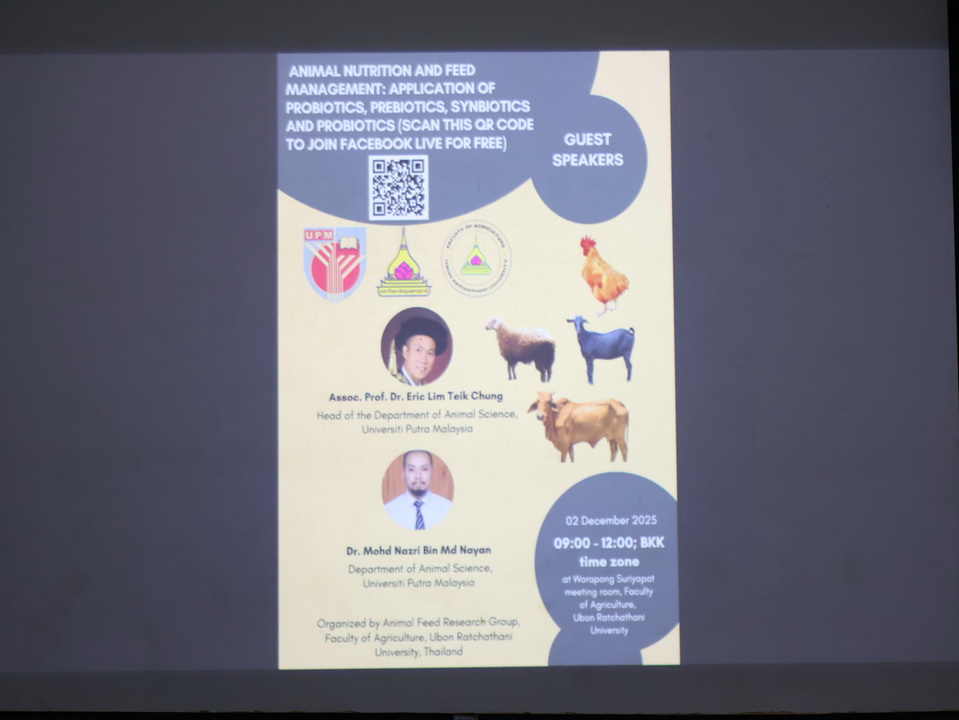รายละเอียดกิจกรรม : การบรรยายหัวข้อด้านเทคโนโลยีอาหารปศุสัตว์ในสัตว์เคี้ยวเอื้องและสัตว์ไม่เคี้ยวเอื้องโดยอาจารย์ 2 ท่าน จาก ภาควิชาสัตวศาสตร์ คณะเกษตรศาสตร์ มหาวิทยาลัย Universiti Putra Malaysia ประเทศมาเลเซีย Assoc. Prof. Dr. Eric Lim Teik Chung Head of the Department of Animal Science, Universiti Putra Malaysia. Dr. Mohd Nazri Bin Md Nayan Department of Animal Science, Universiti Putra Malaysia. ผ่าน facebook live: คณะเกษตรศาสตร์ ม.อุบลราชธานี จัดโดยกลุ่มวิจัยอาหารสัตว์ คณะเกษตรศาสตร์ มหาวิทยาลัยอุบลราชธานี กลุ่มด้านประกันคุณภาพ : 2. การเรียนการสอน 3. กิจกรรมการพัฒนานิสิตนักศึกษา 4. การวิจัย จำนวน 61 ภาพ |