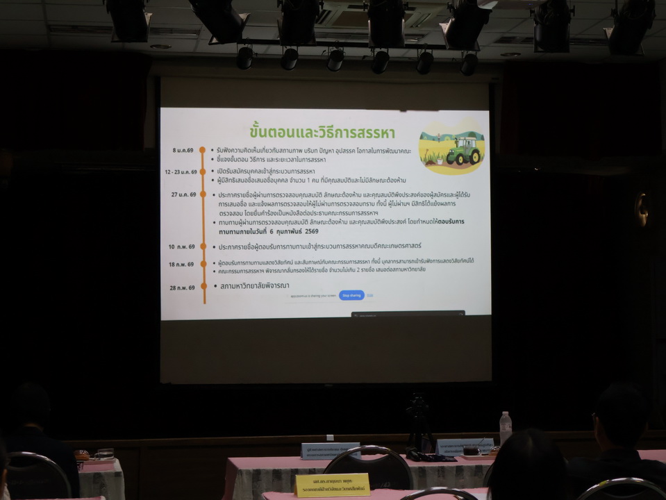 ประธานคณะกรรมการสรรหาคณบดีคณะเกษตรศาสตร์ ได้แจ้งกำหนดให้มีการรับฟังความคิดเห็นเกี่ยวกับ สถานภาพ บริบท ปัญหา อุปสรรค และโอกาสในการพัฒนาคณะ พร้อมทั้ง ชี้แจงกระบวนการสรรหาคณบดีคณะเกษตรศาสตร์ ในวันพฤหัสบดีที่ 8 มกราคม 2568 เวลา 10.00 น. เป็นต้นไป ณ ห้องประชุมวรพงษ์ สุริยภัทร ชั้น 1 อาคารปฏิบัติการเทคโนโลยีการเกษตร คณะเกษตรศาสตร์ กลุ่มด้านประกันคุณภาพ : 1. ปรัชญา ปณิธาน วัตถุประสงค์ และแผนการดำเนินการ จำนวน 50 ภาพ |