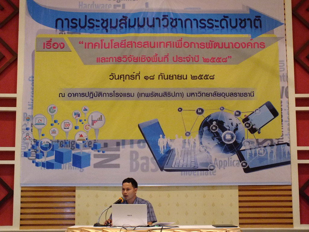 รายละเอียดกิจกรรม : การประชุมสัมมนาวิชาการระดับชาติ เรื่อง "เทคโนโลยีสารสนเทศเพื่อการพัฒนาองค์กรและการวิจัยเชิงพื้นที่ ประจำปี 2558" ณ อาคารปฏิบัติการโรงแรม (เทพรัตนสิริปภา) มหาวิทยาลัยอุบลราชธานี, 18 กันยายน 2558 กลุ่มด้านประกันคุณภาพ : 3. กิจกรรมการพัฒนานิสิตนักศึกษา 4. การวิจัย จำนวน 118 ภาพ