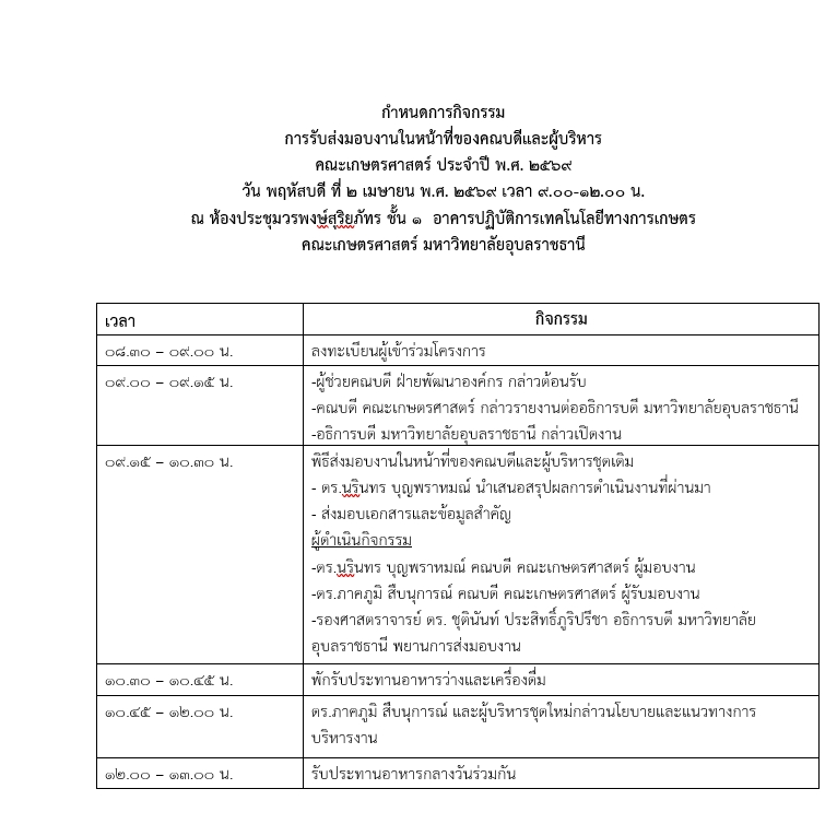โครงการรับส่งมอบงานในหน้าที่ของคณบดีและผู้บริหาร คณะเกษตรศาสตร์ มหาวิทยาลัยอุบลราชธานี